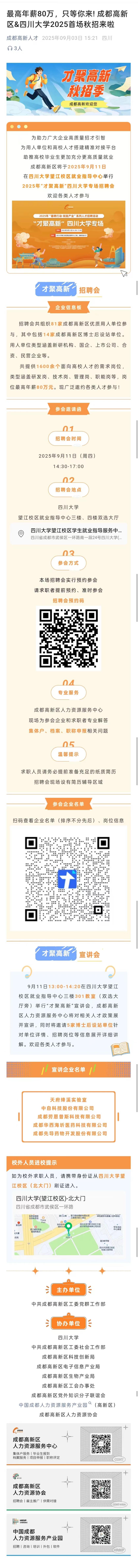 成都高新区今年即将于9月11日(下周四)14:30-17:00在望江校区就业指导中心三楼、四楼举办“才聚高新”365英国上市集团专场招聘会。
