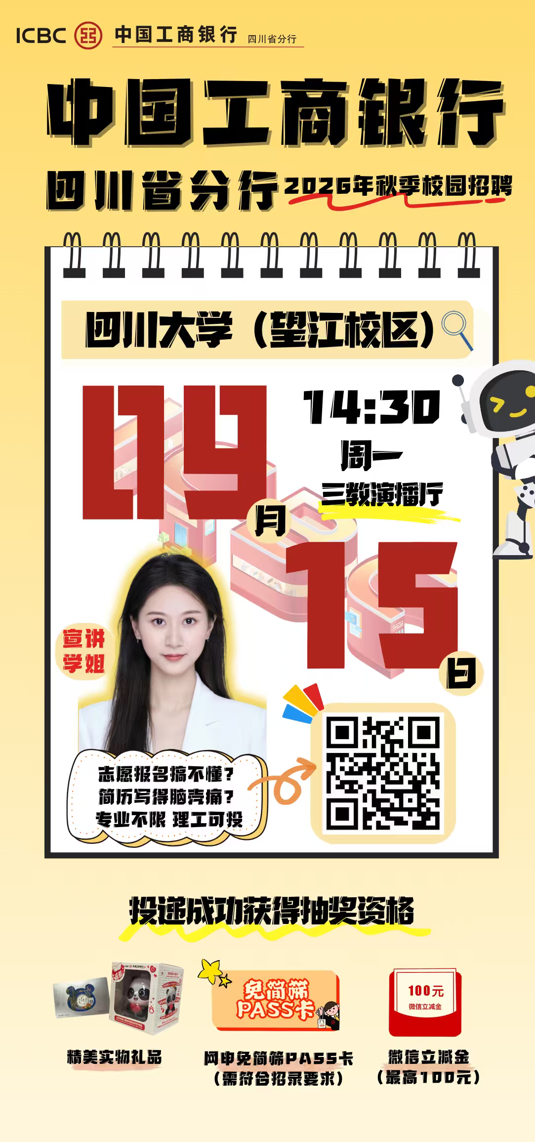 “星光汇天府 梦想耀工行”中国工商银行四川省分行2026年度秋季校园招聘,火热进行中!如何获得一份极具性价比的offer?