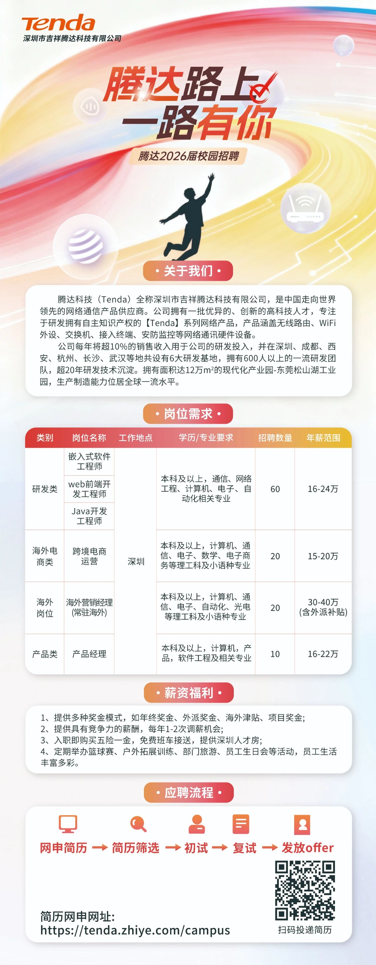 [庆祝][庆祝]中国知名企业--腾达(tenda),逆势扩招,26届校招200+offer,诚邀你加入!