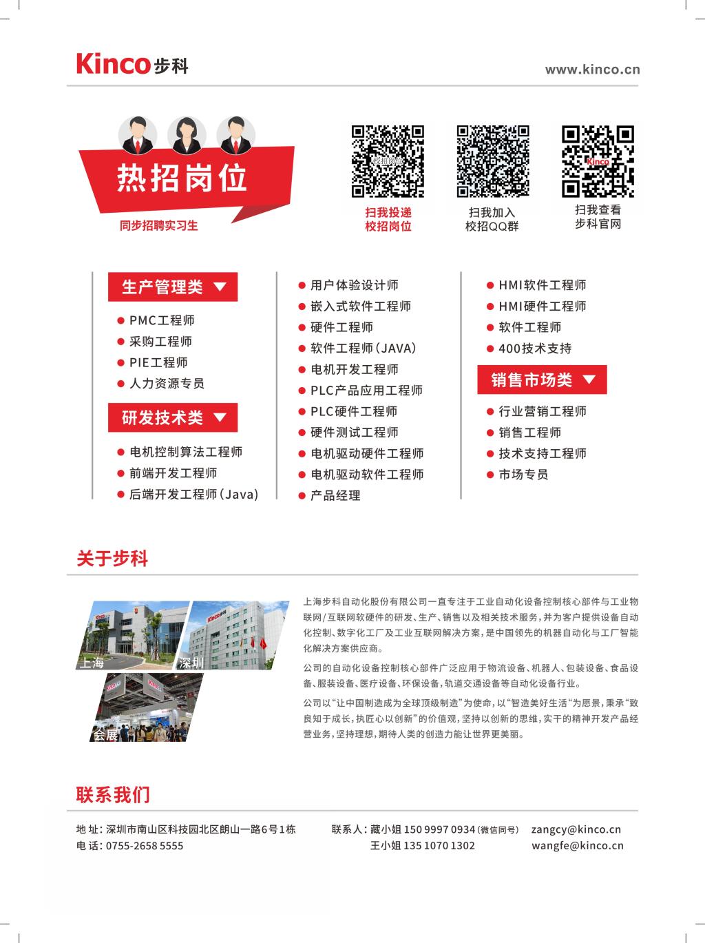 在线投递简历:个人简历、成绩单、英语等级证、获奖证书、个人近照等相应资料发至步科公司人力资源部:wangfe@kinco.cn、zangcy@kinco.cn(主题:应聘岗位+集团+专业)