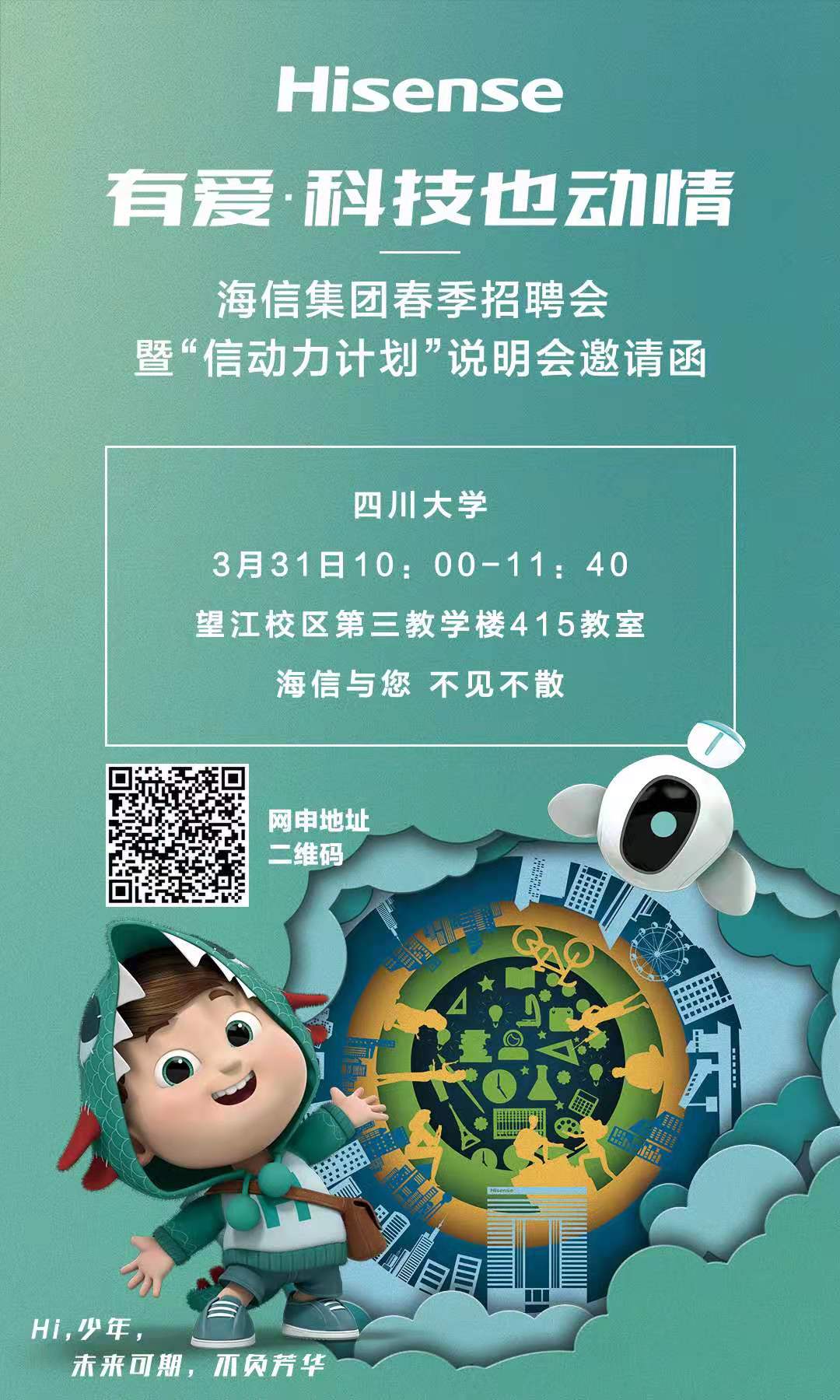 3月31日(周三)10:00在望江校区第三教学楼415室 组织 海信集团春季招聘会暨 “信动力计划”说明会。
