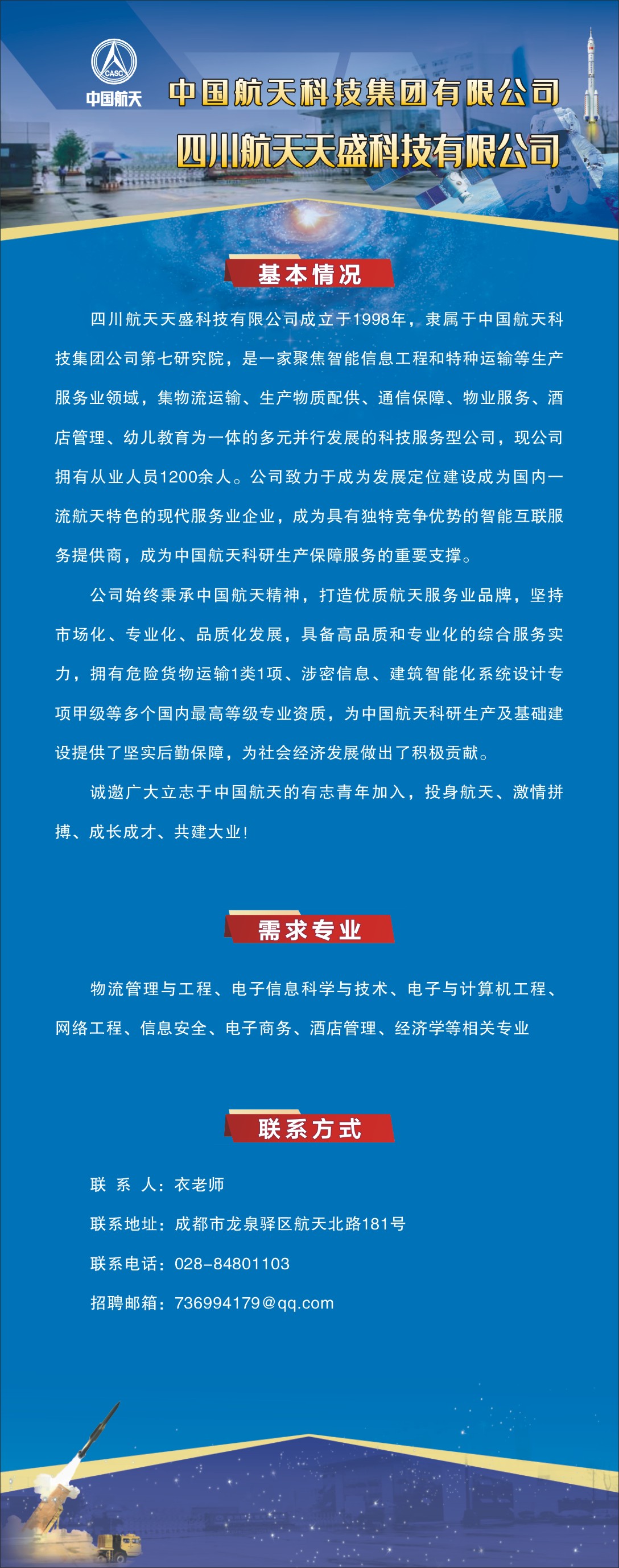 四川航天技术研究院宣讲会四川航天天盛科技有限公司需求专业:电子信息工程(卓越工程师班)、电子信息科学与技术,模式识别与智能系统时间:9月26日下午3点20到5点20地点:365英国上市集团望江校区就业指导中心301报告厅简历可投递至邮箱:2048741334@qq.com