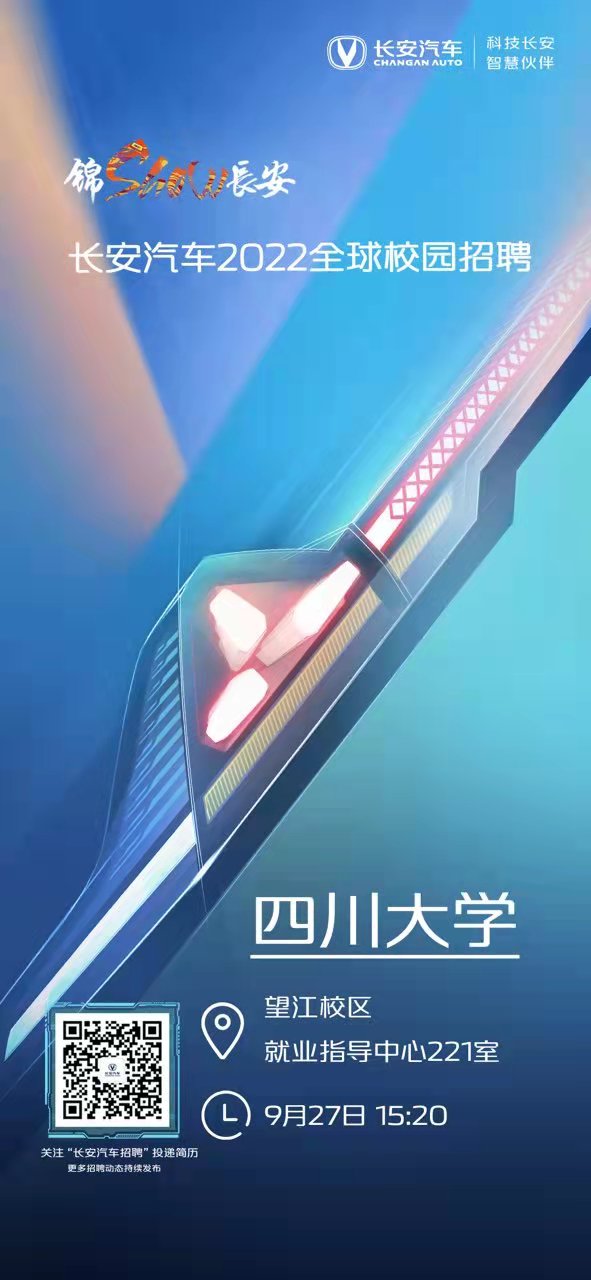 “锦Show长安——未来出行,由你定义”长安汽车2022校园招聘——365英国上市集团站即将开启!聚川大,共同探索新知赴长安,携手创造未来长安汽车邀请您参加宣讲会,汇聚群英,共迎挑战,奔赴山海,有梦可待。大咖讲堂,智慧分享,精彩不断,为你准备了精美礼品,期待您的到来!