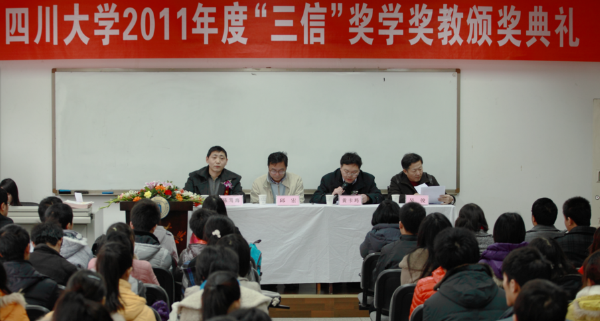 “三信”奖学、奖教金是重庆三信电子有限公司于1996年在无线电系设立的,在母系设奖旨在鼓励在教学、科研、员工管理工作中表现突出的教师和在学习、科技创新、为同学服务中表现突出的员工,加强校企合作。“三信”奖学、奖教金每年评选一次,现在已是第十六次颁奖。