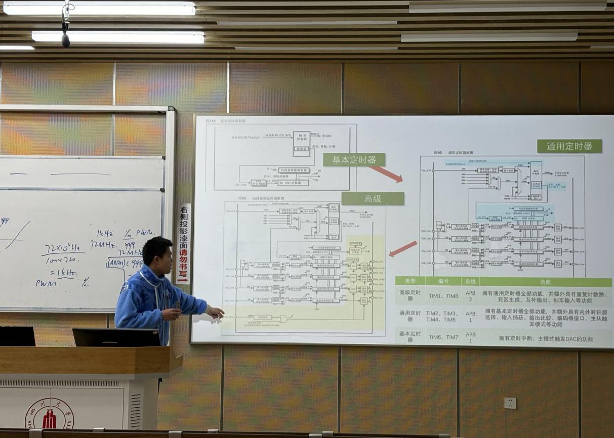 授课伊始,技术部的张瑞卿学长围绕 TIM 定时器展开了详细讲解。他深入浅出地介绍了 TIM 的概念与作用,让同学们对这一在电子电路中发挥关键作用的定时器有了初步认识。随后,学长专门剖析了定时器的不同类型,通过展示与定时器相关的电路,对各个功能进行了生动讲解,使原本抽象的知识变得直观易懂。在深入讲解理论知识的过程中,学长还引入了 RCC 时钟树的介绍。他详细阐释了预分频时序和计时器时序,帮助同学们理解系统时钟如何精准控制各个模块的运行,同时,对 PWM 的基本结构与原理进行了细致剖析,为同学们后续理解呼吸灯的工作机制奠定了坚实基础。