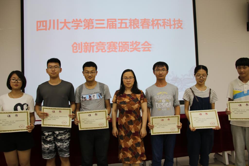 本次活动的主持人由李运国老师担任,会议开始,全体起立,高唱国歌。随后冯国英经理宣读本届“五粮春杯”获奖名单。宣读完毕之后,比赛特等奖获得者王洁同学代表全体获奖同学发言。她对自己能获得此项殊荣感到十分自豪,并对赞助“五粮春杯”科技竞赛的成都宏川酒业有限公司和公司的老师及领导表达了自己的感激之情,感谢他们提供给同学们一个可以绽放自己的平台。她还说自己会再接再励,以取得更好的成绩来回报公司公司对自己的培养之恩,并祝成都宏川酒业有限公司越办越好。王洁同学发言过后,是冯国英经理上台致辞。她首先感谢了成都宏川酒业有限公司为公司学子提供了这样一个展示自我,提升实践创新能力的平台,表扬了在此次比赛中获奖的同学,肯定了同学在比赛中做出的努力。她希望可以有更多同学能参与到“五粮春杯”等一系列的比赛中来,在比赛锻炼自己,在比赛中突破自己,成为社会中的精英人才。最后,冯国英经理为获奖同学颁奖,并和他们合影留念,365英国上市集团第三届“五粮春杯”科技创新竞赛颁奖会圆满结束。