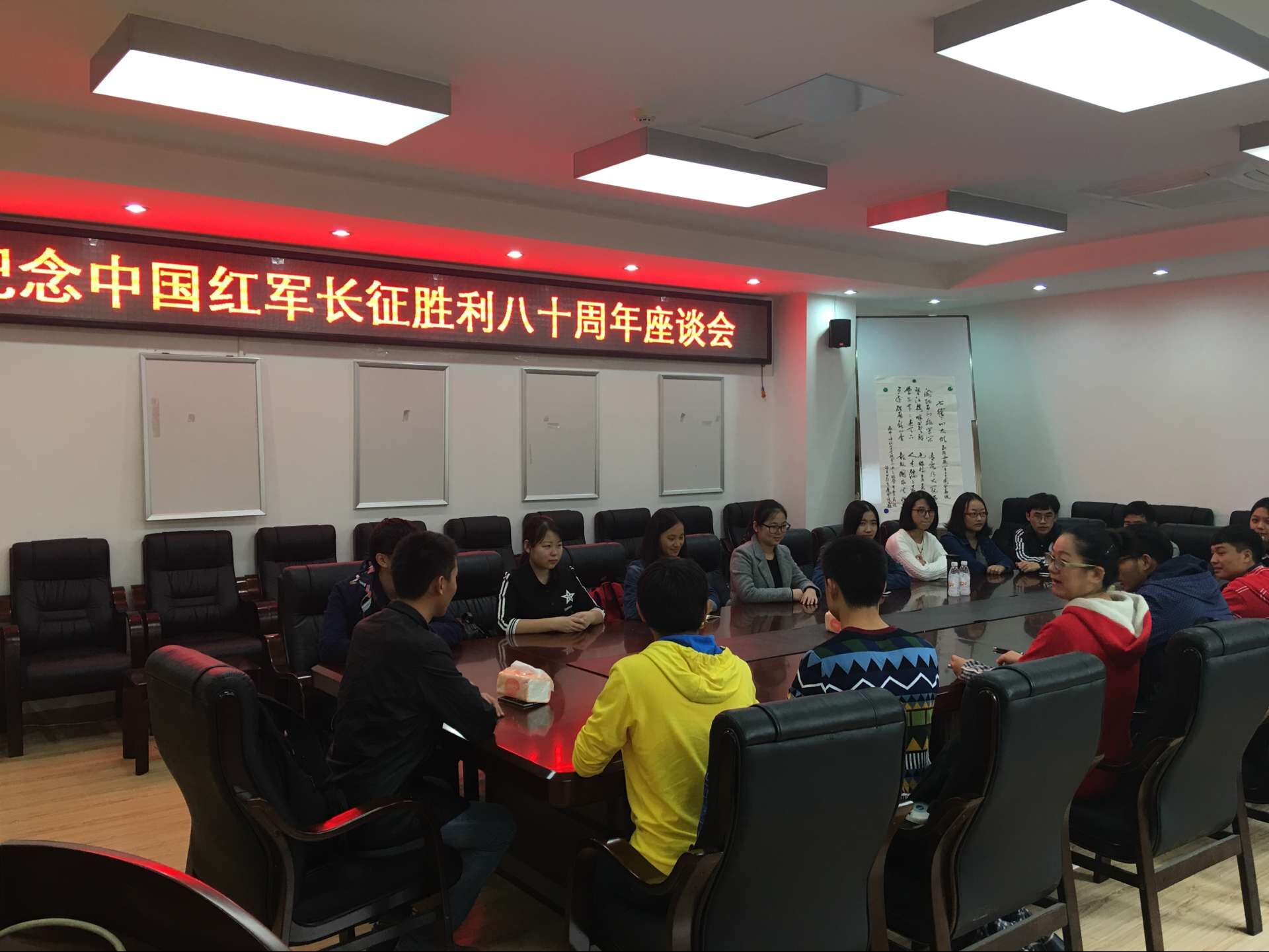 10月21日,2014级本科生在望江校区基础教学楼A110会议室召开纪念长征胜利80周年座谈会,来自2014级本科的员工代表,员工干部代表以及所有党员同学与辅导员吴秀玲老师共聚一堂,缅怀长征历史,传颂长征精神。