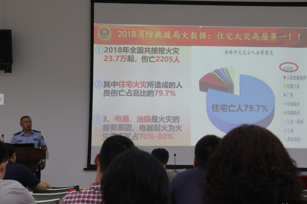 培训会上,何文平教官从已经发生的消防安全事件开始讲解,逐步引入各种消防安全常识,并从消防救援大数据分析了各种消防问题,讲解了各类火灾源的灭火方式和工具,重点讲解了电器引起的火灾的处理方式,并现场演示了灭火器的使用方法。最后,何教官又对教职工提出的消防安全问题进行了解答。